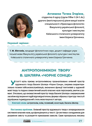 У статті крізь призму антропонімікону проаналізовано онімний простір художнього твору Василя Шкляра «Чорне Сонце», зокрема охарактеризовано позивні військовослужбовців, визначено функції поетонімів у художній мові твору та подано семантичний аналіз власних назв персонажів, ужитих у романі. З’ясовано, що ономастичний простір твору Василя Шкляра є виражальним засобом відтворення подій відповідної епохи, формує образну структуру тексту й відображає індивідуальний стиль мовотворчості автора.