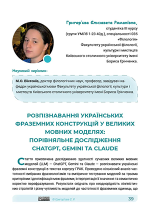 Стаття присвячена дослідженню здатності сучасних великих мовних моделей (LLM) — ChatGPT, Gemini та Claude — розпізнавати українські фраземні конструкції в текстах корпусу ГРАК. Проведено кількісний аналіз частотності вибраних фразеологізмів та емпіричне тестування моделей за трьома критеріями: ідентифікація меж фраземи, інтерпретація її значення та семантично коректне перефразування. Результати свідчать про неоднорідність лінгвістичних стратегій і різну чутливість моделей до частотності фраземних одиниць, що має важливі наслідки для подальшого удосконалення алгоритмів обробки природної мови в українському мовному середовищі.