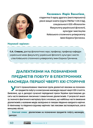 У статті проаналізовано тематичні групи діалектної лексики на позначення предметів побуту в електронних масмедіа першої чверті XXI століття. Виявлено, що в дискурсі сучасної періодичної преси України простежуємо досить часте вживання лексичних і семантичних діалектизмів. У результаті аналізу значного фактичного матеріалу було з›ясовано, що найбільш часте вживання діалектизмів у названих медіа засвідчено в говорах південно-західного наріччя. В північному та південно-східному наріччях такі лексеми застосовуються, але в меншому обсязі.