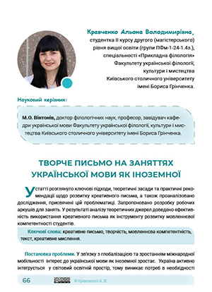 У статті розглянуто ключові підходи, теоретичні засади та практичні рекомендації щодо розвитку креативного письма, а також проаналізовано дослідження, присвячені цій проблематиці. Запропоновано розробку робочих аркушів для занять. У результаті аналізу теоретичних джерел доведено ефективність використання креативного письма як інструменту розвитку мовленнєвої компетентності студентів.