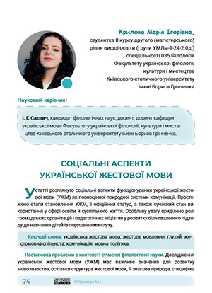 У статті розглянуто соціальні аспекти функціонування української жестової мови (УЖМ) як повноцінної природної системи комунікації. Простежено етапи становлення УЖМ, її офіційний статус, а також сучасний стан використання у сфері освіти й суспільного життя. Особливу увагу приділено ролі громадських організацій і педагогічних ініціатив у розвитку білінгвального підходу до навчання дітей із порушеннями слуху.