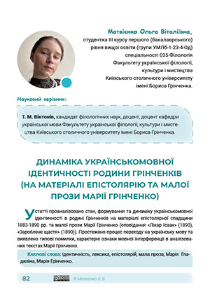 У статті проаналізовано стан, формування та динаміку українськомовної ідентичності в родині Грінченків на матеріалі епістолярної спадщини 1883-1890 рр. та малої прози Марії Грінченко (оповідання «Лікар Ісаак» (1890), «Зароблене щастя» (1890)). Простежено процес переходу на українську мову та виявлено типові помилки, характерні ознаки мовної інтерференції в аналізованих текстах Марії Грінченко.