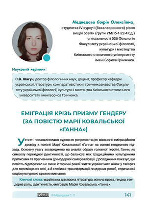 У статті проаналізовано художню репрезентацію жіночого еміграційного досвіду в повісті Марії Ковальської «Ганна» на основі гендерного підходу. Основну увагу зосереджено на аналізі образу головної героїні, Ганни, як символу перехідної ідентичності, що балансує між традиційними культурними приписами та прагненням до модерної самореалізації. Дослідження показує, що повість відображає не лише історичні реалії життя українських жінок у таборах для переміщених осіб, а й глибинні трансформації гендерних ролей, спричинені соціокультурною кризою вигнання.