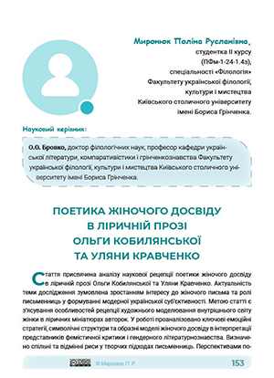 Стаття присвячена аналізу наукової рецепції поетики жіночого досвіду в ліричній прозі Ольги Кобилянської та Уляни Кравченко. Актуальність теми дослідження зумовлена зростанням інтересу до жіночого письма та ролі письменниць у формуванні модерної української суб’єктивності. Метою статті є з’ясування особливостей рецепції художнього моделювання внутрішнього світу жінки в ліричних мініатюрах авторок. У роботі проаналізовано ключові емоційні стратегії, символічні структури та образні моделі жіночого досвіду в інтерпретації представників фемістичної критики і гендерного літературнознавства. Визначено спільні та відмінні риси у творчих підходах письменниць. Перспективами подальших досліджень є вивчення медіаінтерпретацій ліричної прози та розширення порівняльного аналізу в контексті європейського жіночого письма.