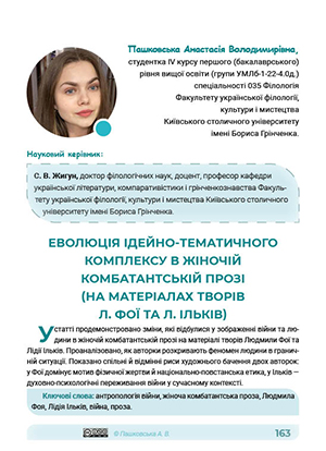 У статті продемонстровано зміни, які відбулися у зображенні війни та людини в жіночій комбатантській прозі на матеріалі творів Людмили Фої та Лідії Ільків. Проаналізовано, як авторки розкривають феномен людини в граничній ситуації. Показано спільні й відмінні риси художнього бачення двох авторок: у Фої домінує мотив фізичної жертви й національно-повстанська етика, у Ільків — духовно-психологічні переживання війни у сучасному контексті.