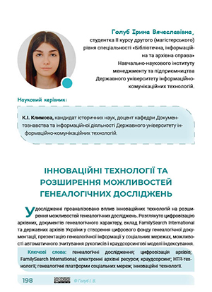 У дослідженні проаналізовано вплив інноваційних технологій на розширення можливостей генеалогічних досліджень. Розглянуто цифровізацію архівних, документів генеалогічного характеру, вклад FamilySearch International та державних архівів України у створення цифрового фонду генеалогічної документації, презентацію генеалогічної інформації у соціальних мережах, можливості автоматичного зчитування рукописів і краудсорсингові моделі індексування.