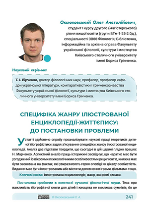 У статті здійснено спробу проаналізувати наукові праці теоретиків дитячої біографістики задля з’ясування специфіки жанру ілюстрованої енциклопедії. Аналіз дає підстави твердити, що сьогодні в цій царині плідно працює Н. Марченко. Аспектний аналіз праць історикині засвідчує, що наратив має бути узгоджений із віковими психологічними особливостями реципієнтів, книжка має бути заснована на фактах, які увиразнюють героя оповіді як цікаву особистість. Видання має бути ілюстрованим або містити доповнення іграми, фільмами тощо.