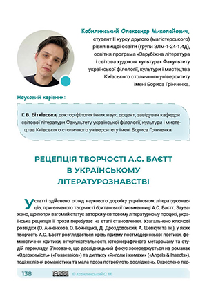 У статті здійснено огляд наукового доробку українських літературознавців, присвяченого творчості британської письменниці А.С. Баєтт. Зауважено, що попри вагомий статус авторки у світовому літературному процесі, українська рецепція її прози перебуває на етапі становлення. Узагальнено ключові розвідки (О. Анненкова, О. Бойніцька, Д. Дроздовський, А. Шевкун та ін.), у яких творчість А.С. Баєтт розглядається крізь призму постмодерніської поетики, феміністичної критики, інтертекстуальності, історіографічного метароману та студій перекладу. З’ясовано, що дослідницький фокус зосереджується на романах «Одержимість» («Possession») та диптиху «Янголи і комахи» («Angels & Insects»), тоді як пізня романістика та мала проза потребують досліджень. Окреслено перспективи подальших студій, які полягають у поглибленні перекладознавчих аспектів та розширенні методологій для цілісної інтеграції творчості А.С. Баєтт в українське літературознавство.